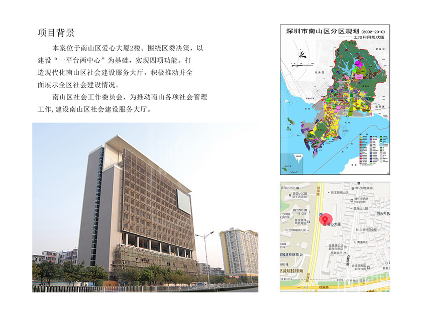 本案位于南山區愛心大廈2樓。圍繞區委決策,以建設“一平臺兩中心”為基礎,實現四項功能。打造現代化南山區社會建設服務大廳,積極推動并全面展示全區社會建設情況。