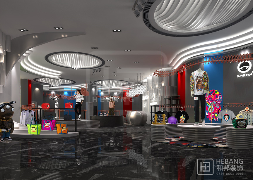 | 設(shè)計(jì)說(shuō)明 | 極具現(xiàn)代風(fēng)格,豐富的色彩運(yùn)用以及富有童趣的設(shè)計(jì)元素使整個(gè)賣(mài)場(chǎng)氛圍輕松、明快。創(chuàng)意十足的天花設(shè)計(jì)以及吸引眼球的墻面裝飾更能吸引消費(fèi)者眼球。 | ||||