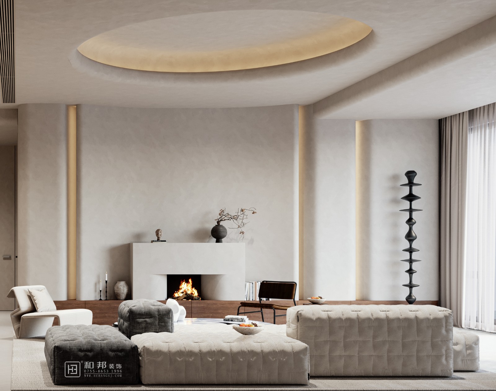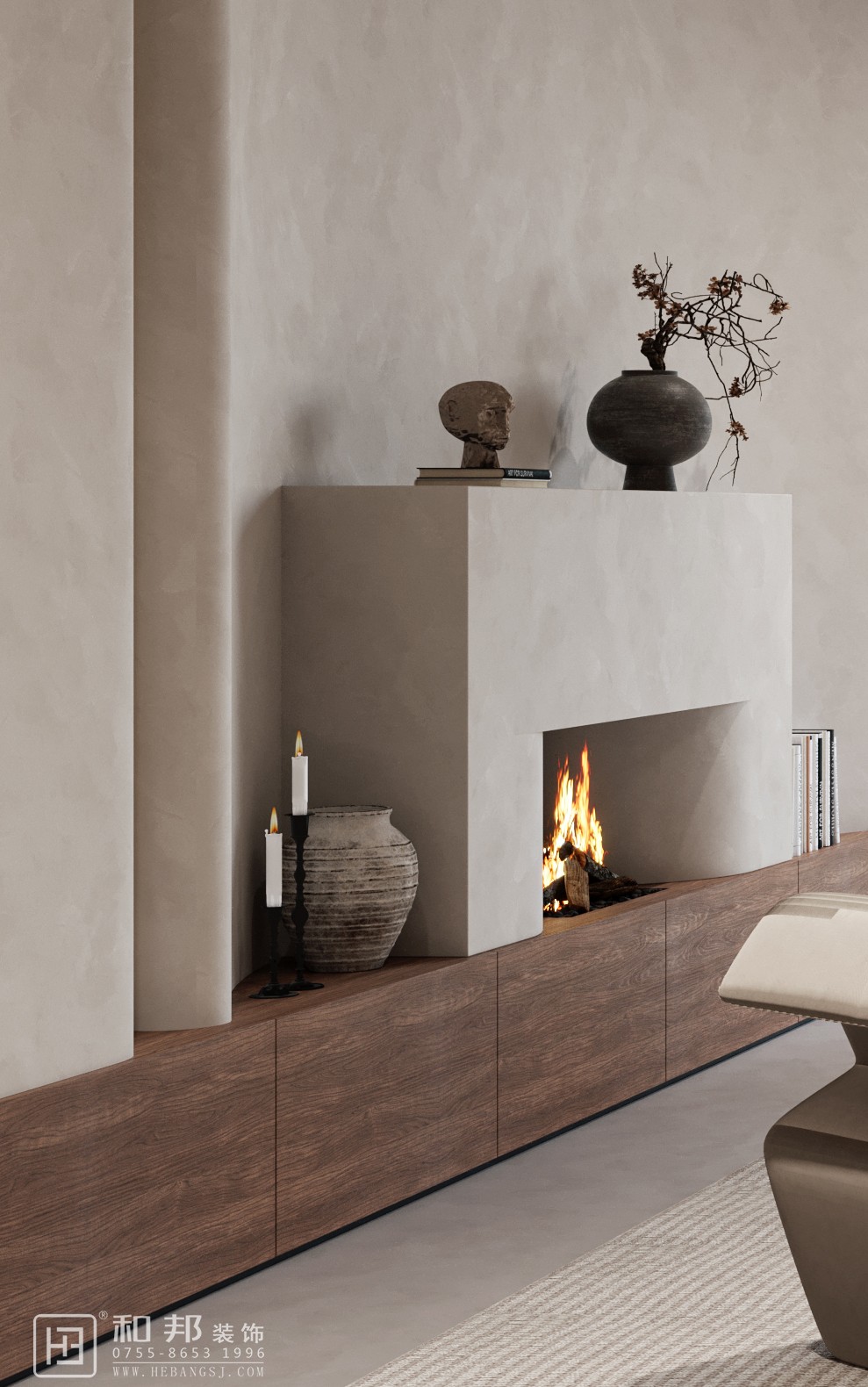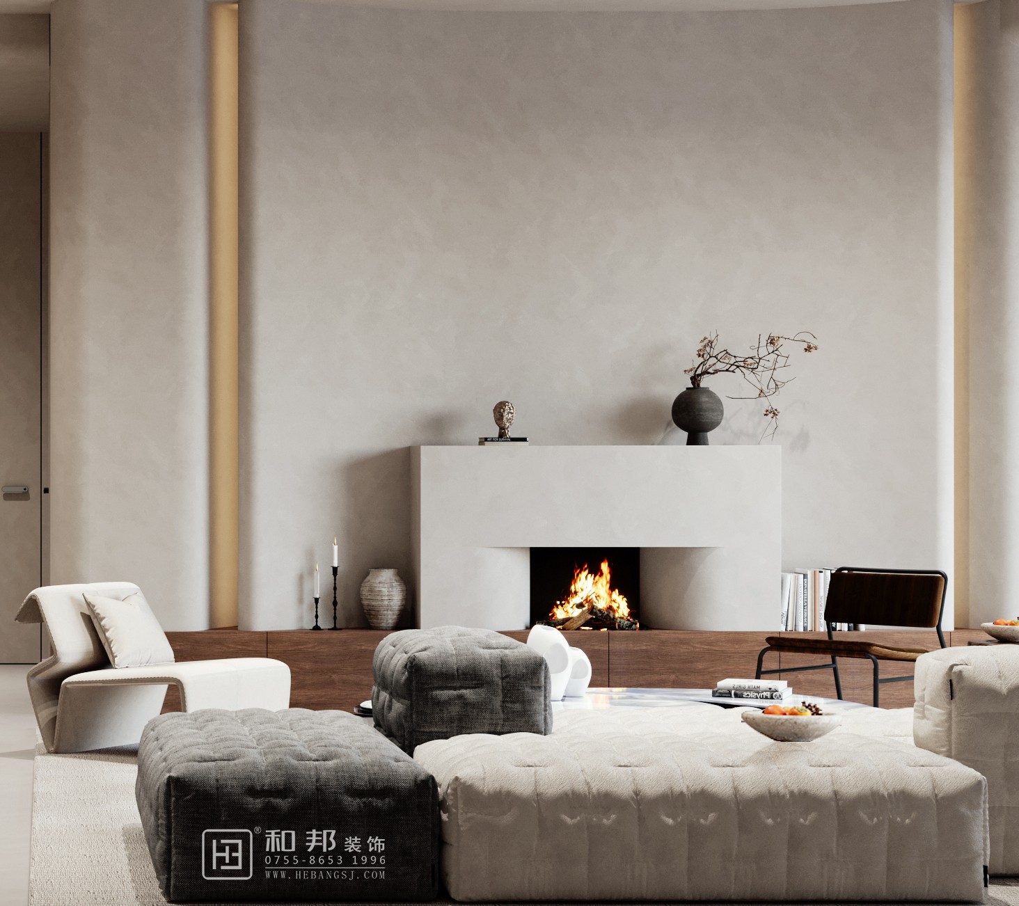 本客廳采用侘寂風格設計,以 “寂” 為核,在質樸、自然的空間中,詮釋歲月沉淀之美。摒棄繁雜,用簡約形態與天然材質,營造寧靜、內省氛圍,讓居者在喧囂中尋得心靈歸處 。